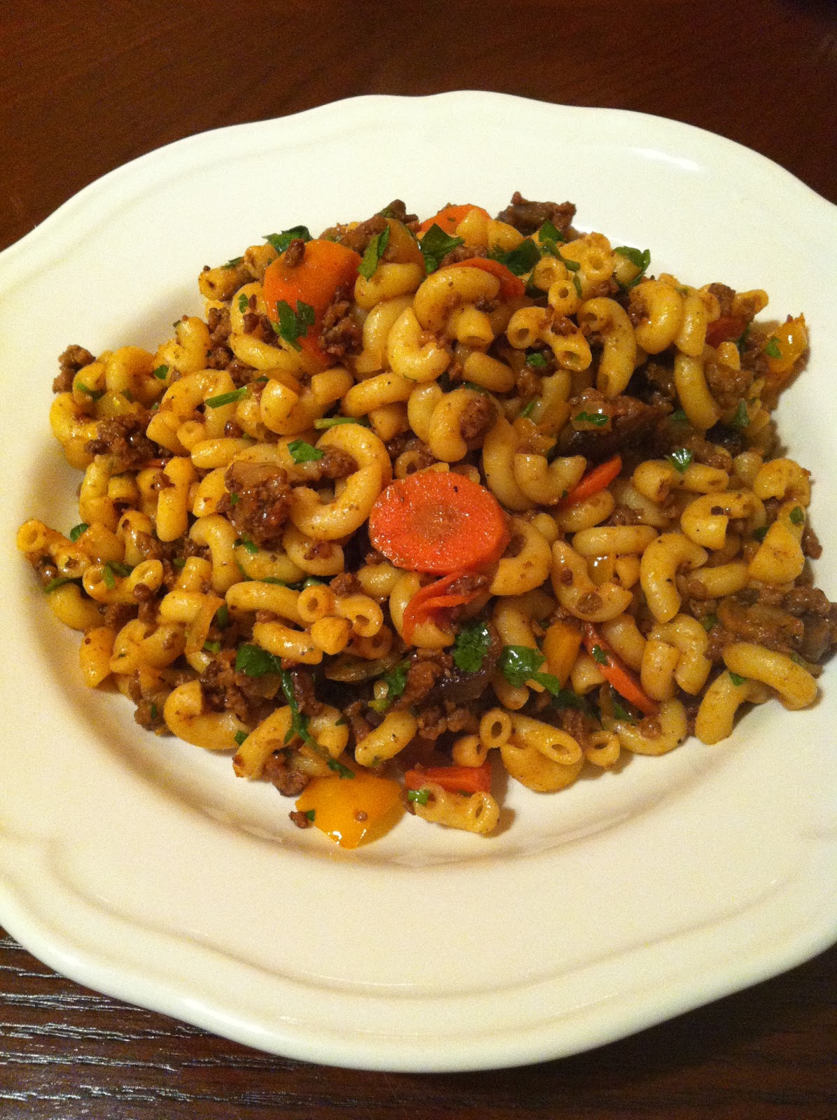 Cuire les pâtes selon la méthode indiquée sur la boîte. Cuire le bœuf haché avec le sel et le poivre environ 10 minutes. Ajouter les oignons et l’ail et cuire environ 5 minutes. Ajouter les poivrons, les champignons et les carottes, puis cuire environ 15 à 20 minutes.Ajouter la sauce Worcesteshire et le ketchup. Mélanger et cuire encore 5 minutes. Mélanger la viande avec les pâtes. Ajouter le persil et voilà!
