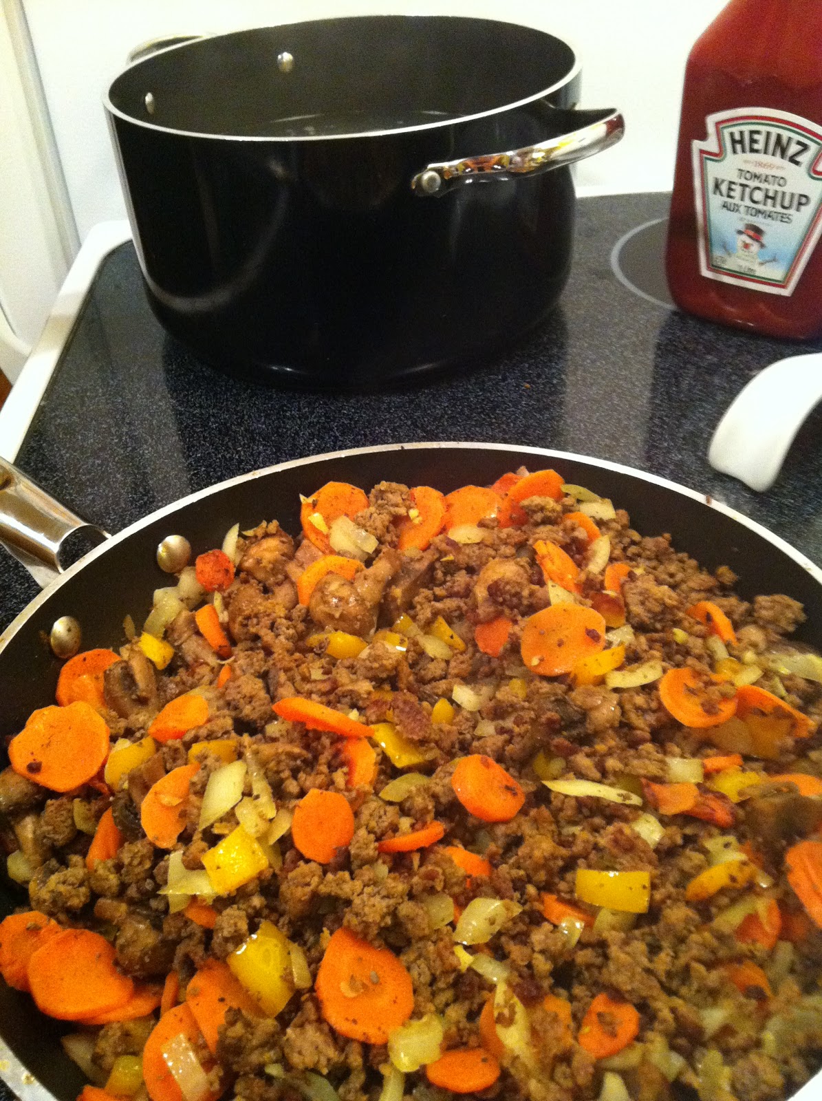 Cuire les pâtes selon la méthode indiquée sur la boîte. Cuire le bœuf haché avec le sel et le poivre environ 10 minutes. Ajouter les oignons et l’ail et cuire environ 5 minutes. Ajouter les poivrons, les champignons et les carottes, puis cuire environ 15 à 20 minutes.Ajouter la sauce Worcesteshire et le ketchup. Mélanger et cuire encore 5 minutes. Mélanger la viande avec les pâtes. Ajouter le persil et voilà!